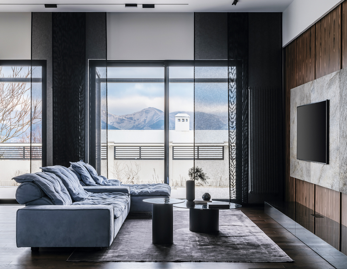 Интерьер дома от Лали Сурмава естественно вписывается в окружающий его ландшафт. Чтобы реализовать идею гармоничного тандема с природой, дизайнер взяла за основу натуральные материалы и монохромную палитру. Заказчики — молодая пара с двумя детьми — ценят красоту во всем и любят путешествовать. Основное их пожелание заключалось в создании спокойного монохромного интерьера с использованием натуральных материалов. Совместная работа с архитекторами позволила связать внешний облик дома и интерьер с помощью авторских приемов. В проекте использовались такие материалы, как дерево, камень и кожа, которые неподвластны времени и красиво стареют. Преобладающие оттенки белого и серого формируют нейтральную основу, схожую с природными тонами, которые свойственны данной локации. На этапе комплектации мы остановили свой выбор на диване Miami Soft от Baxter нежного небесного оттенка, ставшего акцентным во всем доме. Так, появилось искусство от Юлии Деминой, биотическое зеркало Tafla от Zieta Studio. Ст