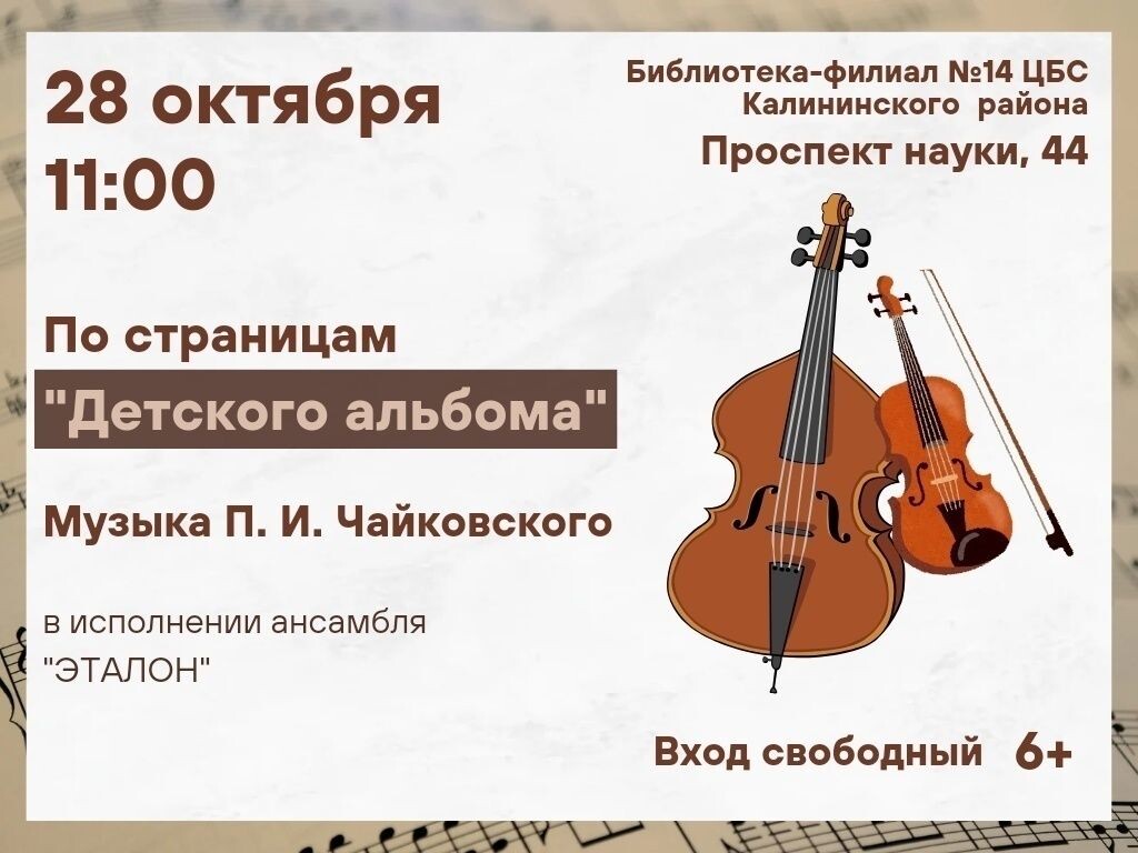 В библиотеке-филиале №14 Калининского района Петербурга в первый день школьных каникул, 28 октября, пройдёт концерт из серии «Понятная классика – детям. Русские композиторы». Как уточнили в районной администрации, в основе программы – «Детский альбом» Петра Ильича Чайковского, дополненный ярким мультимедийным представлением на экране. Выдающийся образец музыки, который состоит из 24 музыкальных пьес, исполнит лауреат международных конкурсов – ансамбль «Эталон» (Мадат и Елена Худайбергановы). Начало концерта –в 11:00. Вход на него – бесплатный. Напомним, что в Московском районе открылся фестиваль «Время первых – время добрых». Он продлится три дня.