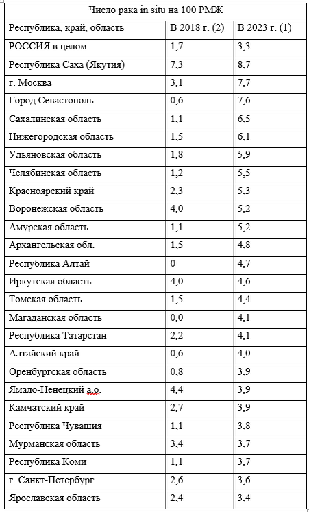 По последним статистическим данным в 2023 г. в России раком молочной железы (РМЖ) заболела 82499 женщин, а умерло от этой болезни 20608 больных (1). Стандартизованные показатели заболеваемости растут, а смертности на протяжении последних 13 лет снижаются. Можно сказать, что эффективность лечения болезни нарастает. По-видимому, вклад в этот успех вносит и профилактическое обследование здоровых женщин с помощью маммографии. Именно таким методом можно выявить рак in situ, то есть рак на нулевой стадии. Очевидно, что такую болезнь можно вылечить гораздо надёжнее, чем на более распространённой стадии. Потеря времени, неприятность маммографии или даже её болезненность, — вот что не нравится никому. Тем не менее, значительная часть женщин мирится с этими неприятностями и проходит регулярные обследования. Давайте посмотрим на результаты. В таблице приведена частота выявления рака in situ на 100 новых случаев РМЖ. В целом по России этот показатель составил 3,3, почти удвоился за последние 5 лет