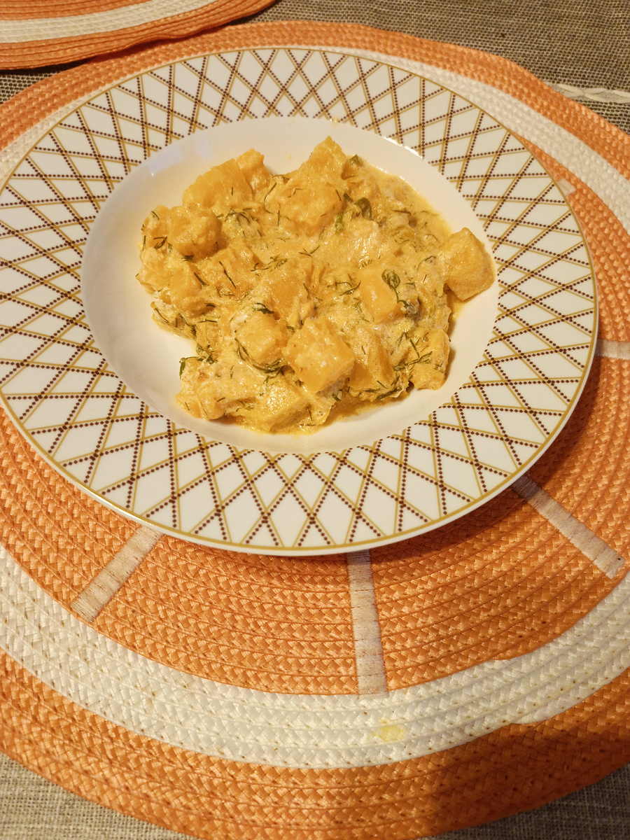 Тыква тушеная в сковороде со сметанным соусом. Простой рецепт ужина из тыквы за 20 минут.