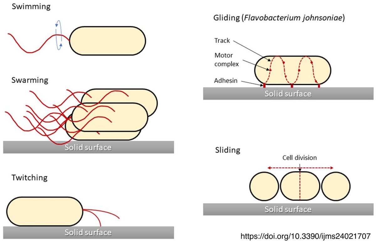 Все есть движение, а в микробном мире, тем более! 👣 Думаю, всем известно, что основная структура, позволяющая бактериям передвигаться, называется «жгутиком» и состоит из чужеродного нам белка флагеллина. Жгутик помогает осуществлять несколько типов движения: 1. Плавание (Swimming) - самый быстрый способ передвижения, характерен для жидкой среды. Если жгутик движется по часовой стрелке - клетка движется «вперёд» в направлении от жгутика, против часовой стрелки - клетка тянется «назад» вслед за жгутиком. 2. Роение (Swarming) - характерно для твёрдой, слегка влажной поверхности. Такой способ используется для жизни в колониях и помогает клеткам «отталкиваться» от своих сородичей во имя образования «переселенцами» новой колонии. Но помимо этого существует очень интересные способы «движения»😉 3. Например, твитчинг (англ. twitch — дергать, тащить) - прикрепившиеся пили, как бы «подтягивают» клетку ещё ближе к прикреплённой поверхности, что создаёт характерные рывки. 4. Белки клеточной стен