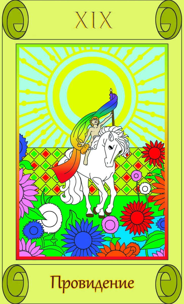 Здесь на карте есть еще знамя в левой руке ребенка. Знамя – это символ эгрегора. В эгрегоре есть определенный закон, правила и есть намерение (провидение). Человек улавливает это намерение, сигнал, идущий от эгрегора, и проводит его. Вы чувствуете, куда едет «лошадь» (частота сахасрара-чакры), и реализуете этот сигнал на своем уровне.