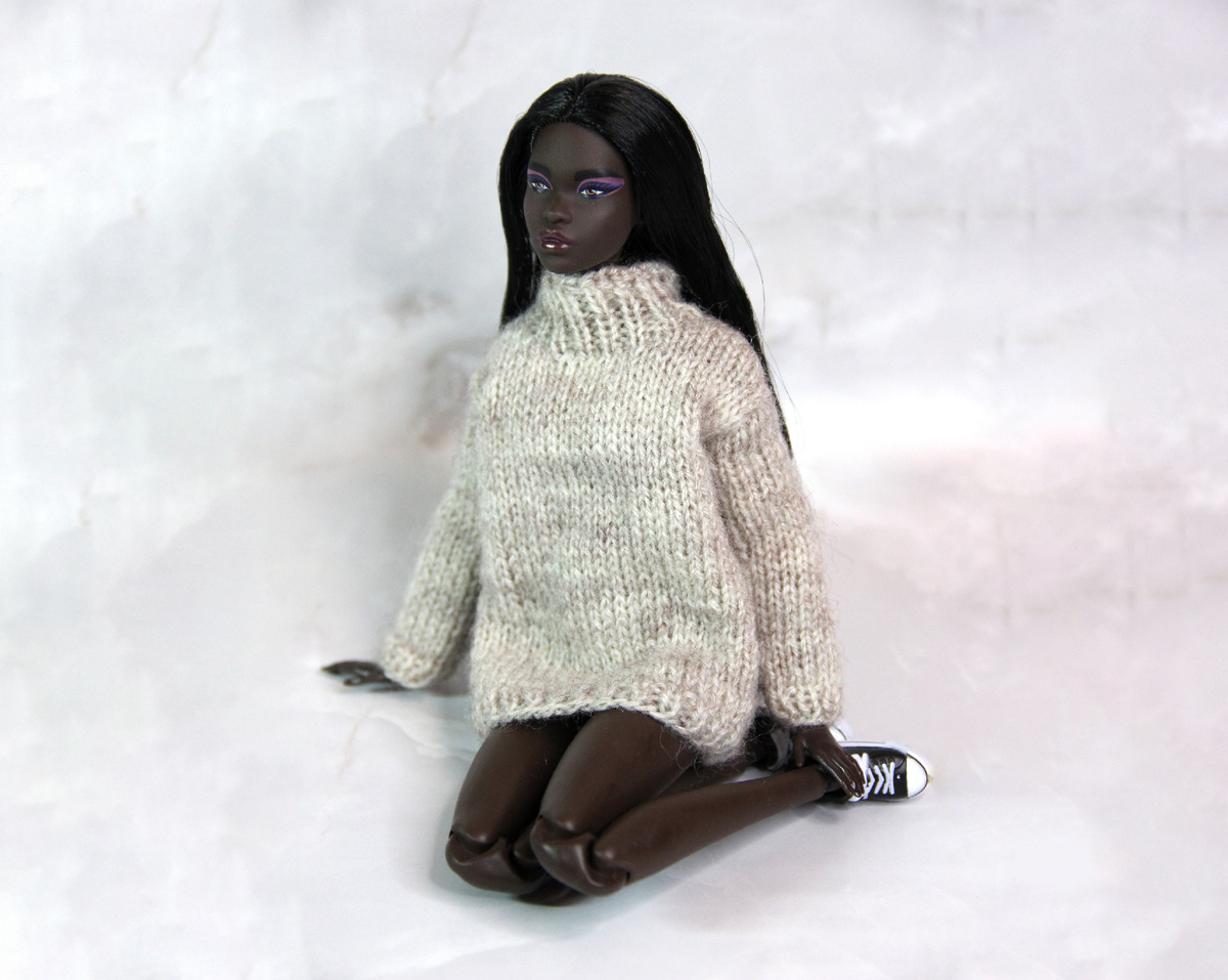 Я безумно счастлива! Наконец-то я смогла поселить у себя давнюю мечту - красотку Симону. Невероятная девочка. Очень темный цвет, мне это безумно нравится. Правда, немного разочаровало качество самого пластика. На ощупь не такой идеальный как моя предыдущая Барби. Руки немного растопырены, одна ступня немного кривая из-за того, что кукла была криво упакована, нога прижата и смотрела в сторону. По тойже причине каблук у ботинка тоже искривился. Но все эти недостатки перекрывают тугие шарниры и довольно ровный мейк. Кстати, я боялась, что мейк будет сильно яркий, как на некоторых фото. Но он не такой как я думала и он просто идеален ) Я уже примерила ей свитер. Он лежал у меня давно, не подходил моей кукле, но, мне кажется, Симоне он подходит просто идеально. Сейчас в процессе создания нескольких вязаных вещей конкретно для Симоны, а так же для другой девочки. Помимо этого обкатываю некоторые выкройки, так что скоро покажу что у меня получилось нашить. Есть куча идей, но мало времени