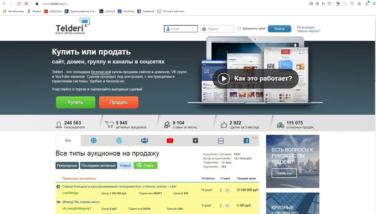 Востребованная площадка, занимающаяся безопасной куплей-продажей сайтов и доменов. Биржа считается одной из крупнейших в Рунете с огромным количеством пользователей. Телдери ежедневно подтверждает свою репутацию надёжного гаранта безопасности - сотрудники компании собственноручно контролируют все движения по сделке - будь то миниатюрный сайт или крупный многомиллионный проект. Для удобства навигации на сервисе есть фильтры, которые можно выставлять при поиске нужного ресурса. Тонкая настройка фильтров позволит сократить поисковую выдачу до минимума, ограниченного заданными настройками. У платформы есть как преимущества, так и недостатки. Преимущества: Недостатки: