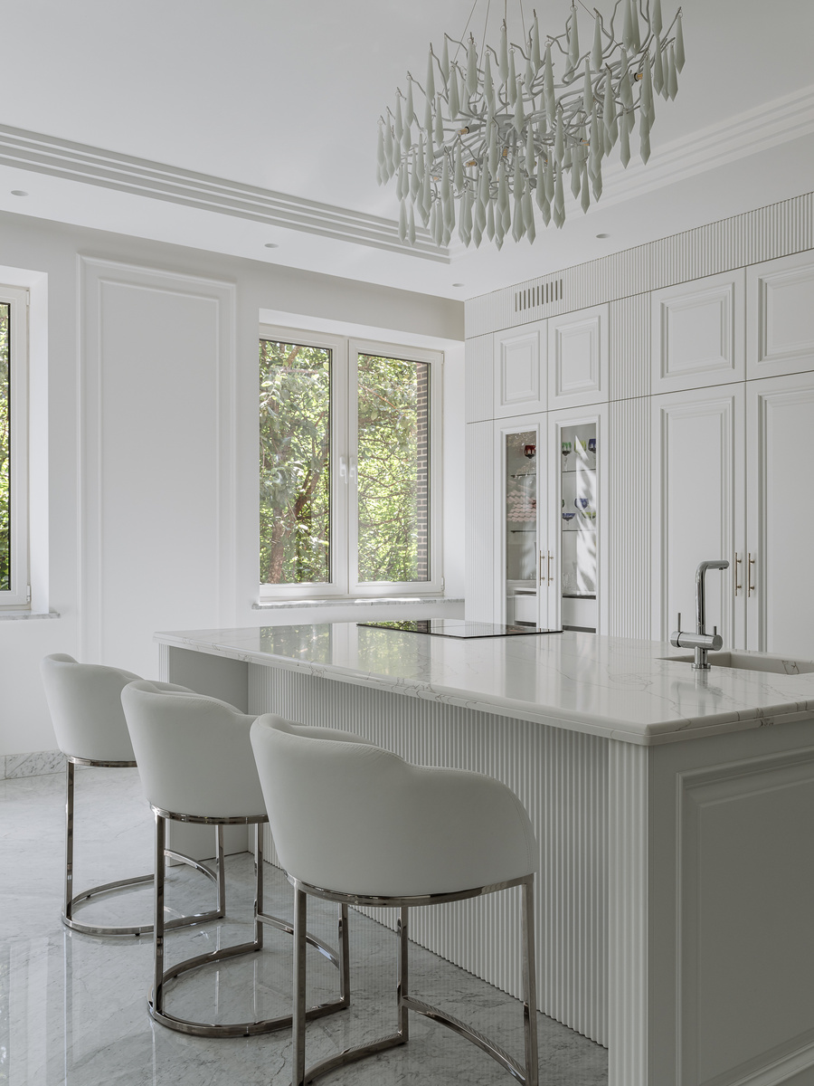 Эта кухня сочетает в себе элементы классического стиля и современный рельеф на фасадах. Центральное место занимает массивный кухонный остров со столешницей из кварцевого агломерата. Витражные шкафы с подсветкой внутри позволяют выставить напоказ красивую посуду и декоративные элементы, добавляя глубину и теплый свет в общий облик кухни. Лаконичная хромированная фурнитура и барные стулья подчеркивают строгость линии и элегантность.