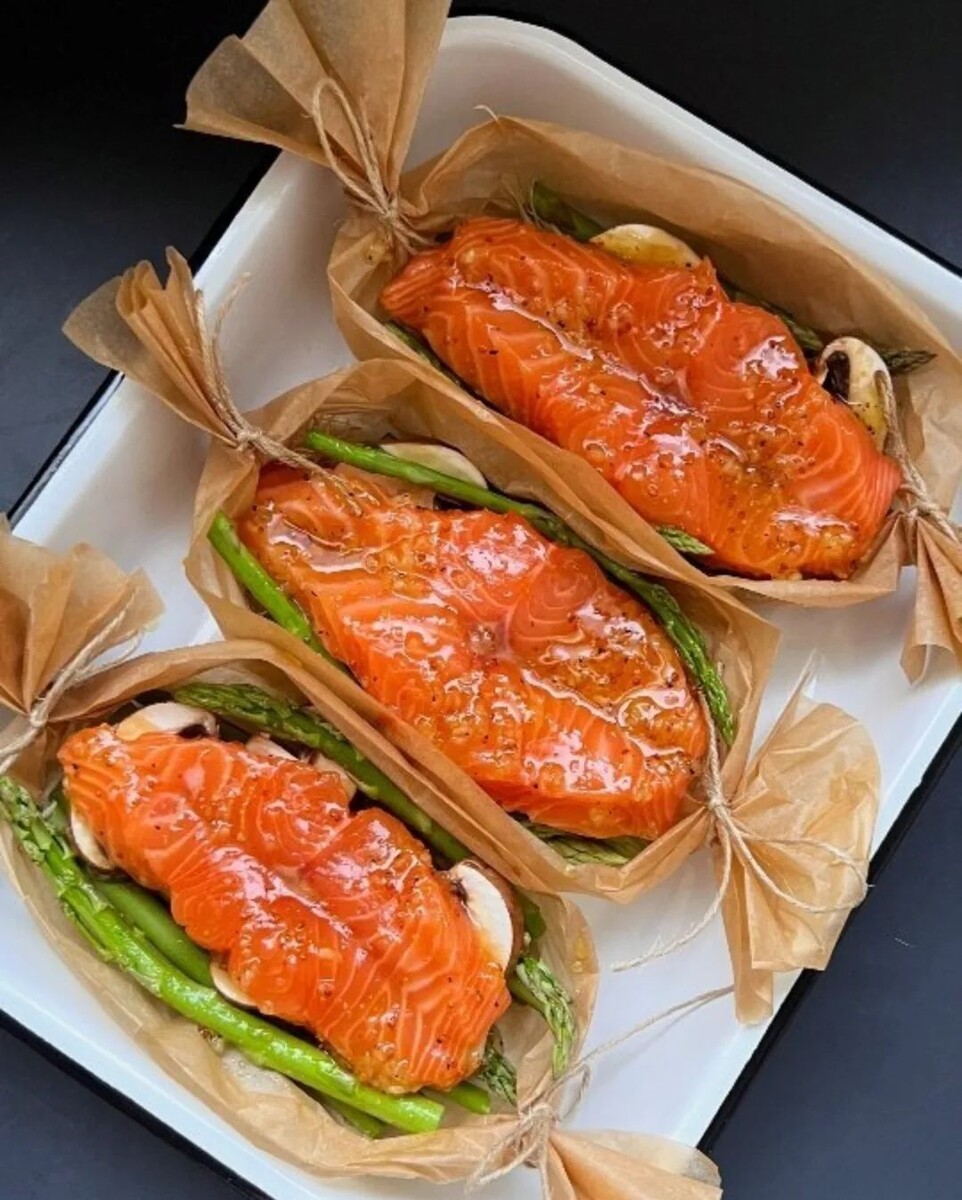 Сегодня поделюсь как удивить гостей вкусным и интересным блюдом. Разрежьте лосось. Разогрейте духовку до 180 градусов. Разрежьте пергамент и сделайте «лодочки» как на фото. Поместите овощи на пергамент, сбрызните оливковым маслом,посолите. Выложите лосось сверху. Щедро полейте соусом и выпекайте 20 Минут Блюдо готово ✅ ©️Рецепты с Катриной