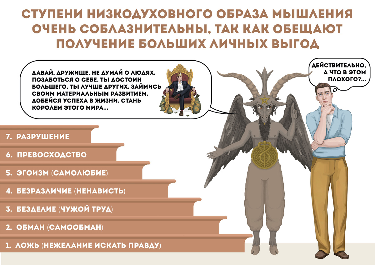 И если высокодуховный образ мышления можно ассоциировать с созидательным Божественным началом, которое ведет всегда к истинному и коллективному счастью, то низкодуховное мышление — это прямая связь с сатанинским началом, сущность которого только в разрушении (именно поэтому на картинке к статье изображен Бафомет — одно из олицетворений Сатаны). Кажущаяся легкость в достижении счастья на низкодуховной лестнице жизненного пути — это иллюзия (ложный самообман), которая в конечном итоге неизбежно рассеивается, подобно самому обыкновенному дыму...