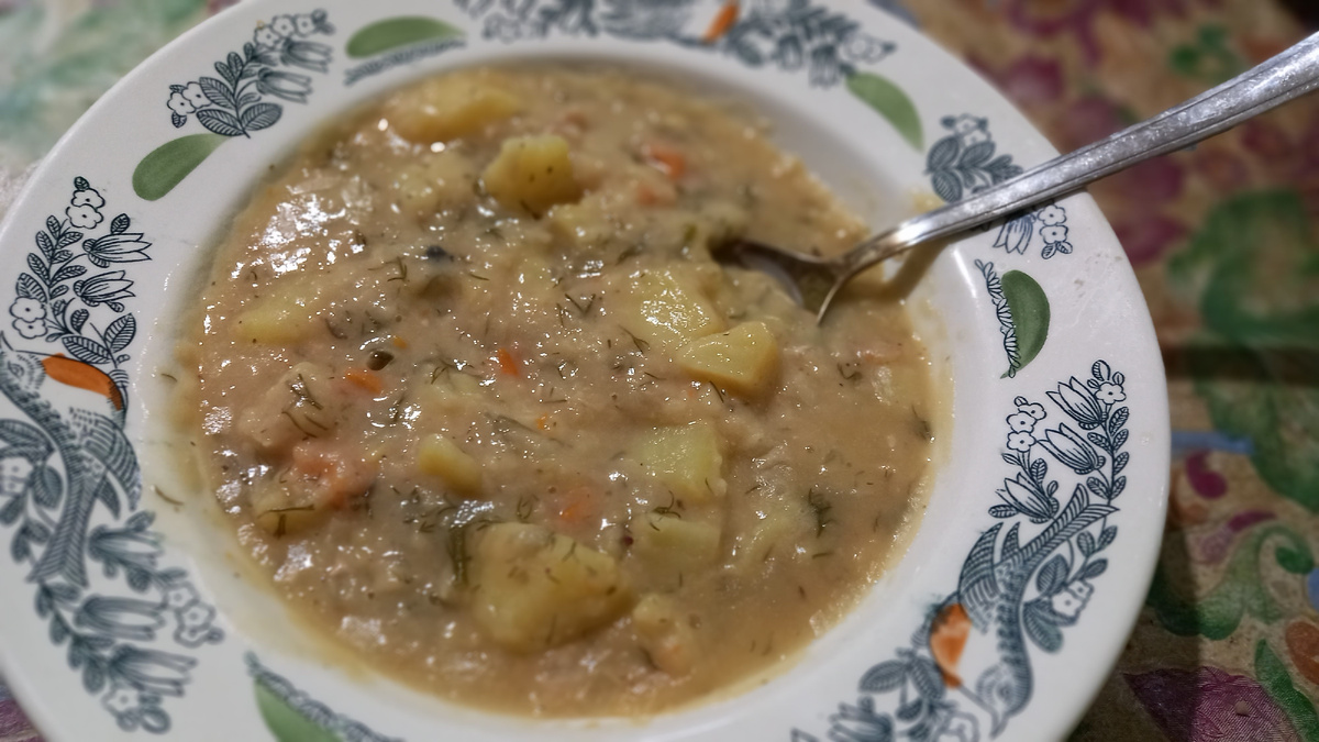 Кладем в кастрюлю свиные ребрышки, заливаем их водой,ставим на огонь. Как только вода закипит,добавляем горох. Заранее горох можно замочить. Варим один час. Тем временем нарезаем кубиками картофель, морковь трем на терке, репчатый лук нарезаем кубиками. Лук и морковь обжариваем. Через час вынимаем ребрышки, нарезаем на более мелкие кусочки, добавляем картофель, варим примерно 30 минут, затем добавляем кусочки ребрышек, лук с морковью, соль, перец, лавровый лист. Доводим суп до кипения.