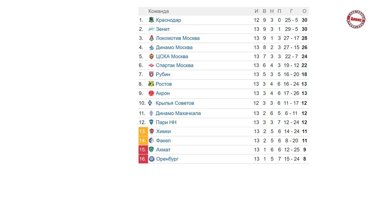 Чемпионат России по футболу. РПЛ. 13 тур. Результаты, таблица, расписание + таблица ФНЛ