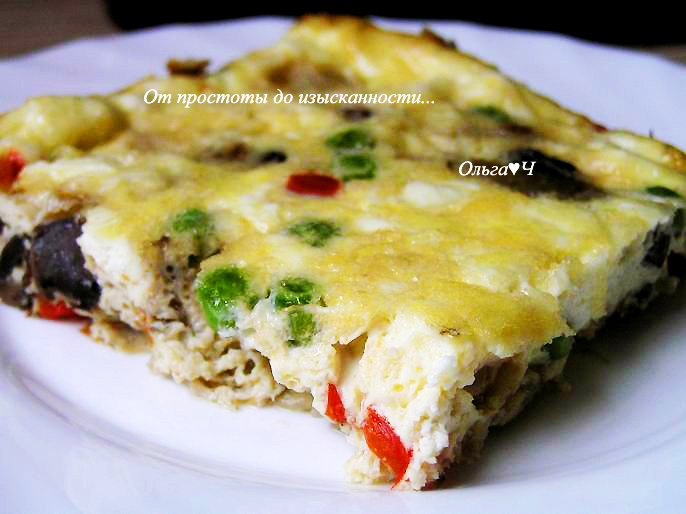 1-2 ст. л. растительного масла Приготовление: На растительном масле обжарьте лук и грибы, чуть присолите. Добавьте сладкий перец, еще немного обжарьте. Овощи с грибами выложите в смазанную маслом форму для запекания, добавьте горошек и измельченный чеснок. Раскрошите сверху сыр. Залейте смесью из яиц и сливок. Запекайте при 200*С около 20-25 минут до румяности. Приятного аппетита! Вам также могут понравиться: