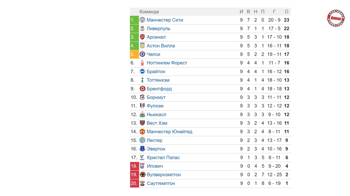 Сегодня вас ждут результаты 9 тура Англии и таблицы других чемпионатов. На 5-й минуте Холанд, после навеса Матеуша Нуньеша, вогнал мяч в сетку. Гости сумели ответить только порванной футболкой норвежца (1:0). «Горожане» одержали 7-ю победу в АПЛ и на сутки возглавили таблицу. Как сыграл Ливерпуль узнаем, через 1 минуту. Команды расщедрились на голы во второй половине. Каземиро ответил на мяч Саммервилла. Добил Манчестер пенальти, реализованный в конце Боуэном. У МЮ было 15 минут добавленного времени, но отыграться не удалось (2:1). Нужно рассказать, какой-нибудь интересный факт. Футболисты МЮ заколотили за всю историю 244-й мяч в ворота «молотобойцев». Жан-Филип Матета с передачи Эзе открыл счет, во втором тайме мяч уже самого Эзе отменён из-за офсайда (1:0). Статистика шпор за 1,5 месяца – 7 побед при двух поражениях. События развивались так: на 4-й минуте отменили гол Палмера. На 18-й Джексон забивает чистый мяч. На 32-й Исак сравнивает. После перерыва Палмер вырывает победу (2:1). Ч