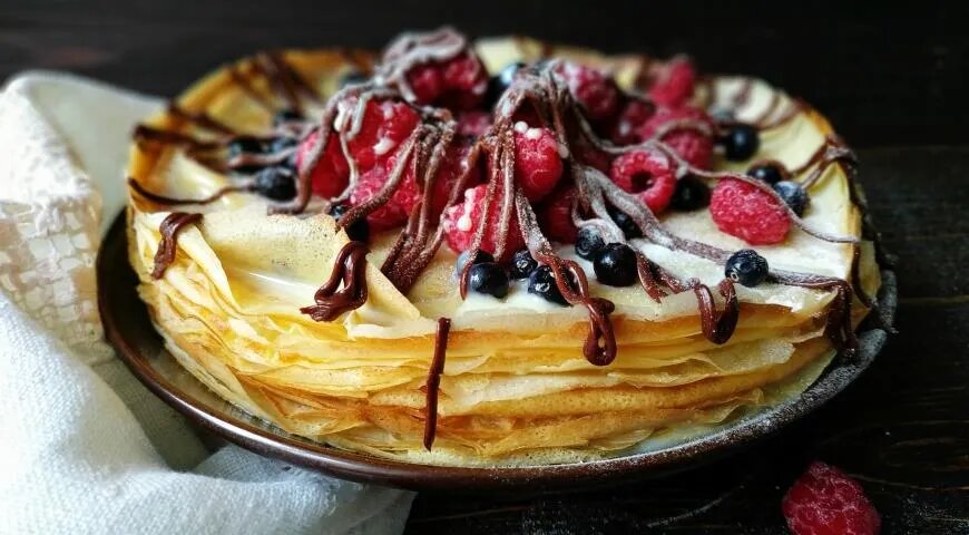 Блинный торт со сгущенкой готовится из заранее испеченных тонких блинчиков, которые можно сделать по любому рецепту. Чем тоньше будут блины, тем более воздушным получится торт. Украсьте его сверху свежими ягодами и взбитыми сливками, чтобы насладиться вкусным чаепитием в компании близких людей. Начните с приготовления теста для блинного торта со сгущенкой. В глубокой миске взбейте яйца, тёплое молоко, сахар и соль. Просейте муку через сито и добавьте к яично-молочной смеси, затем тщательно перемешайте. Добавьте растительное масло в тесто и снова перемешайте венчиком. Накройте миску с тестом чистым полотенцем и оставьте при комнатной температуре на полчаса. Затем влейте в тесто кипяток и аккуратно перемешайте. Для жарки блинов лучше использовать чугунную сковороду, так как она придаст блинам румяную корочку с мелкими дырочками. Хорошо разогрейте сковороду и смажьте её небольшим количеством растительного масла. Налейте немного теста на сковороду и обжаривайте блин с одной стороны до золо