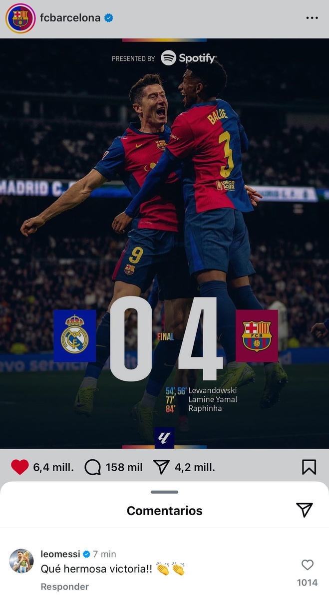 Ханси Флик превратил «Барселону» в машину – теперь в этом нет сомнений. В Лиге чемпионов каталонцы уверенно разобрались с «Баварией», а через пару дней разнесли «Мадрид» на «Сантьяго Бернабеу». За мощной победой «блауграны» из-за океана следил легенда клуба – Лео Месси. Аргентинец поздравил «Барсу», оставив короткий комментарий под публикацией о матче с «Реалом»: «Какая красивая победа!» Фанаты рады комментарию Месси, но у некоторых нашлись претензии – почему Лео почти сутки ничего не писал о победе «Барсы» в класико. Несколько комментариев из соцсетей: 💭 «Конечно, он любит «Барсу»! Некоторые фанаты уже успели его разнести за то, что он так долго ничего не писал, но это же бред». 💭 «Получается, он сутки думал над комментарием из трех слов? Плевать ему на «Барсу», это очевидно». 💭 «А если бы «Мадрид» победил, Роналду не оставил бы даже маленький комментарий. Лео никогда не забывает свой родной клуб». 💭 «Месси всегда следит за «Барсой», теперь вы в этом убедились. Я по нему очень ску