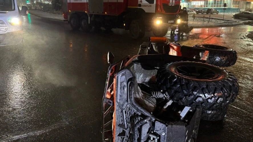 Квадроцикл прилег на бок рядом с гаражным комплексом в Ноябрьске
