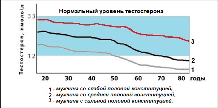 В этой статье я хочу рассказать о влиянии андрогенного дефицита на развитие аденомы простаты. Основная причина развития аденомы, как известно, это возрастные гормональные нарушения, или т.н. «мужской климакс». Известно, что предстательная железа является гормонально-зависимым органом и на неё сильное влияние оказывают мужские половые гормоны, и в первую очередь тестостерон. Однако с возрастом его выработка снижается, наступает андрогенный дефицит. Таблица - индивидуальные сроки наступления возрастного андрогенного дефицита в зависимости от половой конституции (уровня тестостерона в 20 лет) Андрогенный дефицит встречается при недоразвитии яичек, при одно- или двухстороннем неопущении яичек в мошонку (крипторхизм), после травматического повреждения яичек, при выраженном ожирении, при длительном употреблении анаболических стероидов, после длительной лучевой- и химио-терапии, при атеросклерозе сосудов, при диабетической ангиопатии (сахарный диабет), а так же, при гипертонической болезни. С