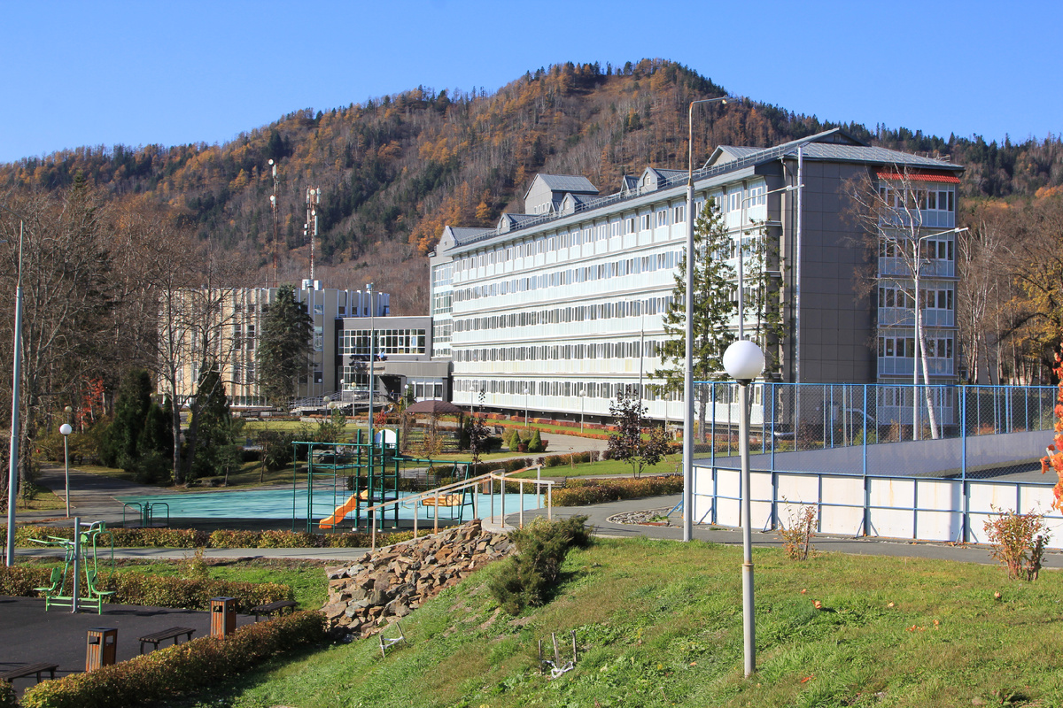 Южно-Сахалинск удобен тем, что от него на машине можно доехать до множества интересных мест. До некоторых - и на общественном транспорте. К примеру, на синегорском автобусе можно добраться не только в сам Синегорск, но и в Санаторное, которое расположено на пути к нему. Село примечательно размещением в нём санатория "Синегорские минеральные воды" - собственно, с его созданием оно и появилось на свет. Ещё на рубеже 19-20 веков на этом месте обнаружили кислые ручейки - оказалось, что это минеральные источники. Японцы разобрались в воде и обустроили здесь лечебницу. Уходя с острова в конце Второй мировой войны, они уничтожили своё детище и забетонировали основной источник. Пытливые советские учёные провели новые буровые работы, обнаружили сходство местных вод с Ессентуками и постановили: санаторию - быть! Зданий здесь было несколько, а современное открылось в 1981 году. Время чувствуется и в модерново-бетонной круглой башней, и в длиннющем корпусе, рассчитанном на 262 места. К счастью,
