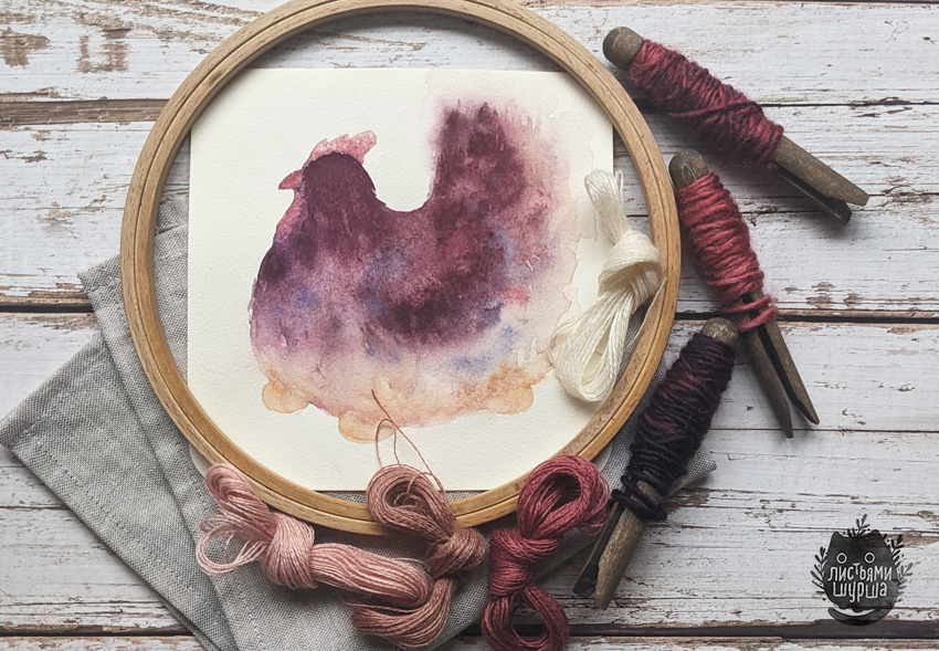 Начинаем с эскиза. У курочки довольно простая форма, главное, чтобы она смотрелась округло и пухло. Общая гамма вышивки - бордово-розовая, с небольшим добавлением фиолетово-синего и белого. Подбираем сочетающиеся цвета и основу. Основные нитки для вышивания - шерстяное мулине "Риолис", и меланжевая пряжа. Натуральный лён - идеальная основа для практически любой вышивки, на его нейтральном цвете хорошо смотрятся большинство цветов. Переносим основные контуры на ткань и начинаем вышивать. Голова и спинка - самые тёмные места, стежки идут от основания клюва, веером расходясь вниз. Пёрышки у настоящих кур растут примерно в таком же направлении, это помогает передать форму. Курочка у нас рябая, поэтому стежки чередуются по цвету. Водим новые цвета. Живот и нижняя часть курочки очень светлые, поэтому стараемся сделать плавный переход. Если стежки делать не только разными по цвету, но и по размеру, это придаст вышивке живости и лёгкой небрежности. Мелкие детали вышиваем более тонкими нитка