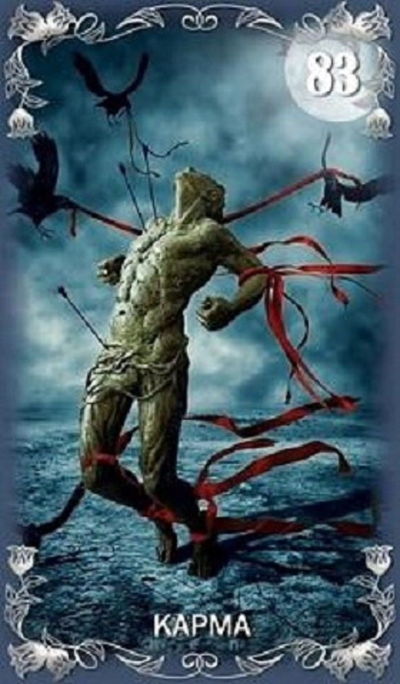 Эта карта символизирует карму человека и всё что может быть с ней связано. Аркан «Отработка кармических долгов» свидетельствует о том, что в нашей жизни события предопределены и связаны с нашими поступками, как в этой жизни, так и в прошлых (сансара). На это же указывает и Новый Завет Библии, где говорится: «Каждому воздастся по делам его».