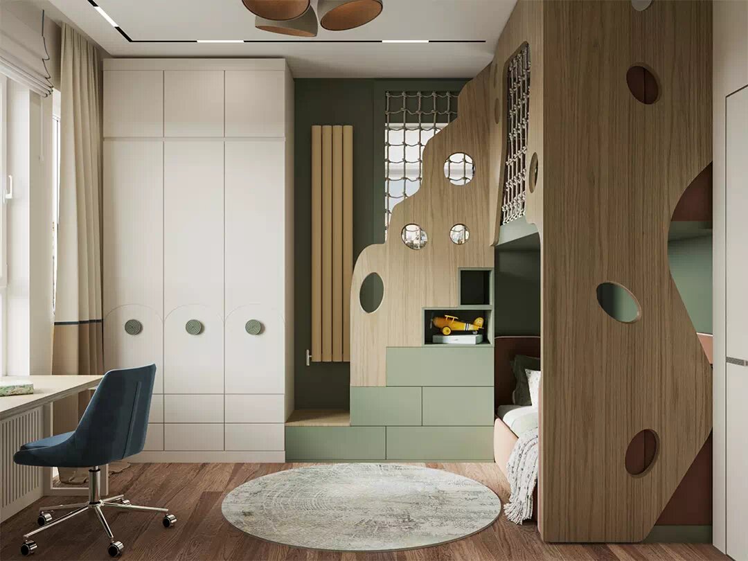 Светлая дизайнерская мебель для двоих детей с зелеными акцентами