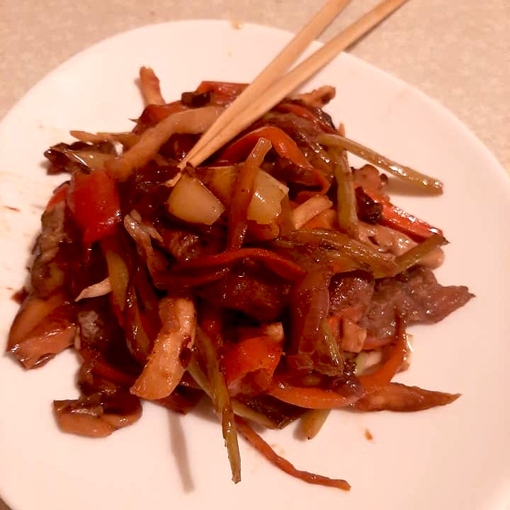 Блюдо невероятно вкусное, с выраженной «этнической» ноткой, а готовится быстро (около 20 минут). Идут в него многие овощи. «База» -- мясо (сегодня - 300 г говядины, но можно и мясо птицы), лук (1 шт.), чеснок (2-3 зубчика), морковь (граммов 100), соевый соус. Исключаются, пожалуй, лишь томаты и баклажаны, иначе акцент переходит на кавказскую кухню. У меня сегодня, кроме базы - болгарский перец (1 шт.), некрупный дайкон(150 г), черешковый сельдерей (75 г) и вешенки (100 г). Можно заменить на бело- или краснокочанную капусту, соцветия цветной, кабачок, корневой сельдерей, даже нашу репу. Можно добавить даже ананас. Нарезка важна! Всё режется брусочками, даже чеснок, мясо полосками, желательно поперёк волокон, но я не особо за этим слежу, главное - чтобы все ингредиенты были примерно одной формы и размера. Нужен либо вок, либо толстостенный сотейник, либо казан. На дно наливаем масло (на указанные ингредиенты - граммов 50), раскаляем до белого дымка, закладываем поочерёдно, начиная с мяса
