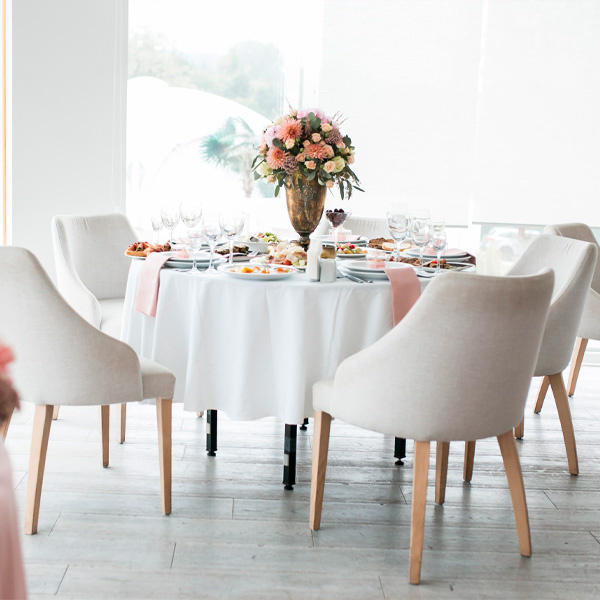 - Праздничный дизайн. Белая скатерть смотрится на столе нарядно, придавая интерьеру атмосферу праздника.