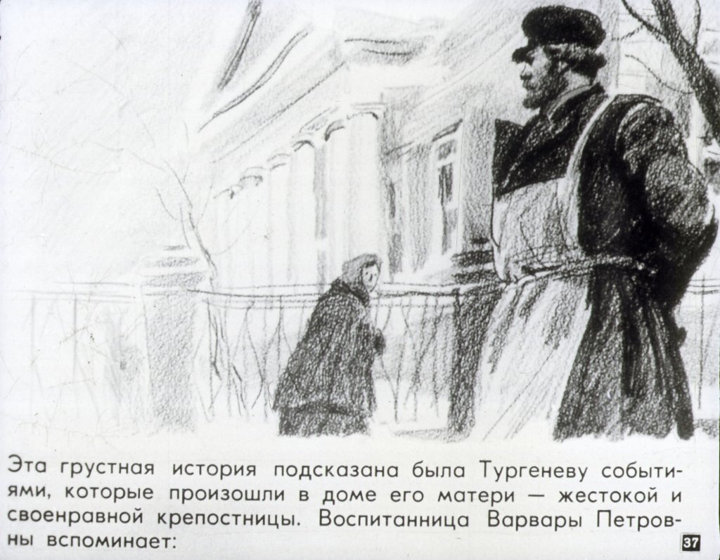 Полюбилась Герасиму дворовая девка Татьяна. Рада не рада, а попала девка под его покровительство. Как все глухонемые, он очень был догадлив и очень хорошо понимал, когда над ним или над ней смеялись. Однажды за обедом кастелянша, начальница Татьяны, принялась ее, как говорится, шпынять и до того ее довела, что та, бедная, не знала куда глаза деть и чуть не плакала с досады. Герасим вдруг приподнялся, протянул свою огромную ручищу, наложил ее на голову кастелянши и с такой угрюмой свирепостью посмотрел ей в лицо, что та так и пригнулась к столу. Все умолкли. Герасим снова взялся за ложку и продолжал хлебать щи.