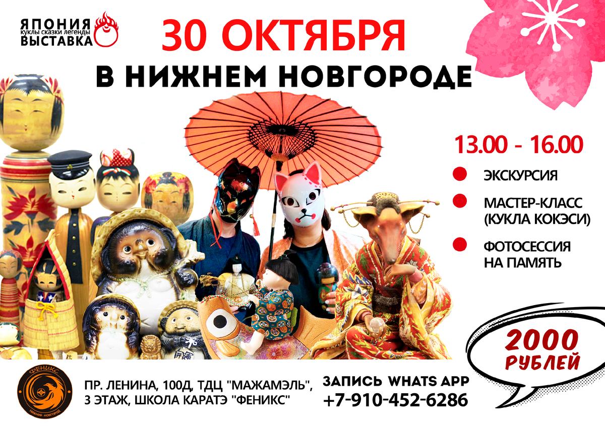 В среду 30 октября приглашаем всех желающих из Нижнего Новгорода в школу каратэ «Феникс». Мы проведем интерактивную экскурсию и проведем мастер-класс по росписи деревянных традиционных японских кукол Кокэси. После мастер-класса дети и взрослые смогут сфотографироваться на память в японских хаори, с масками фольклорных персонажей, с японскими зонтиками, веерами, и пр. Время проведения 13.00 - 16.00