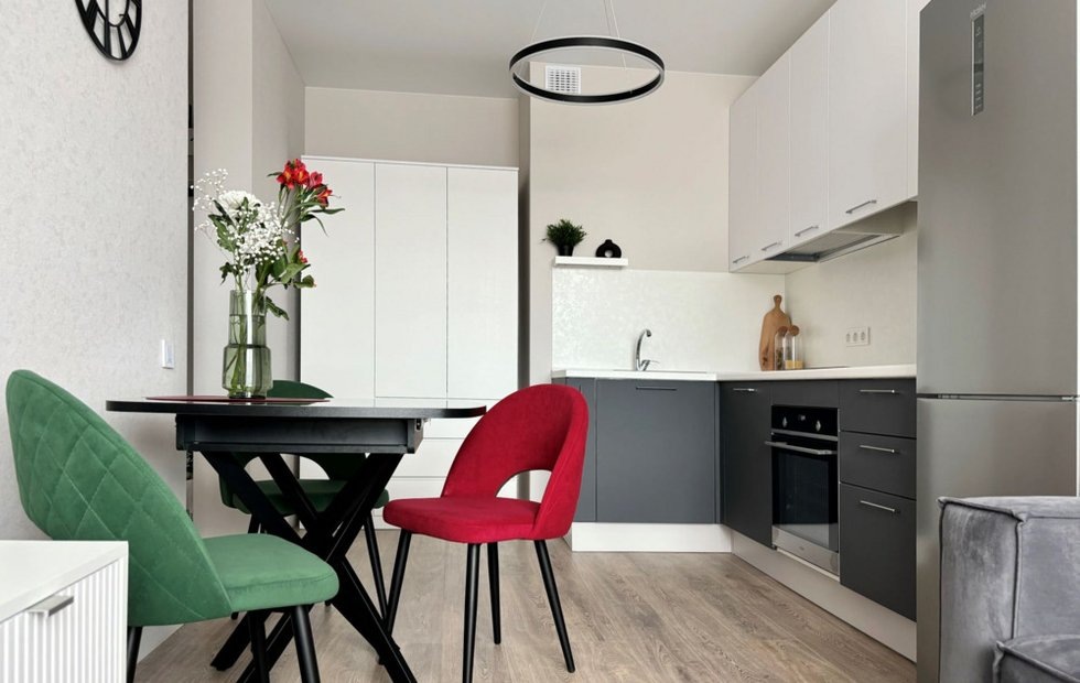 Главная фишка проекта — использование цветов итальянского флага. Получился красивый интерьер с яркими винными и зелеными акцентами Место: Москва Тип дома: Новостройка Метраж: 54 кв. м Застройщик: Группа «Самолет», ЖК «Тропарево Парк» Комнаты: 2 Cанузлы: 1 Высота потолков: 2,7 м Бюджет: 500 тыс. руб. Дизайн: Юлия Грабилина Стилист: Юлия Грабилина Заказчица обратилась к дизайнеру Юлии Грабилиной с просьбой подготовить к аренде двухкомнатные апартаменты в ЖК бизнес-класса «Тропарево Парк» от застройщика «Самолет». По плану в квартире есть просторная кухня-гостиная, две изолированные комнаты, прихожая и совмещенный санузел. Такая планировка отлично подойдет для семьи с маленьким ребенком или молодой пары. Застройщиком была выполнена базовая отделка и установлен кухонный гарнитур со встроенной техникой. Требовалось подготовить объект к сдаче в аренду при помощи инструментов хоумстейджинга: сделать интерьер ярким и привлекательным и уложиться в минимальный бюджет. Квартира сдавалась с готово