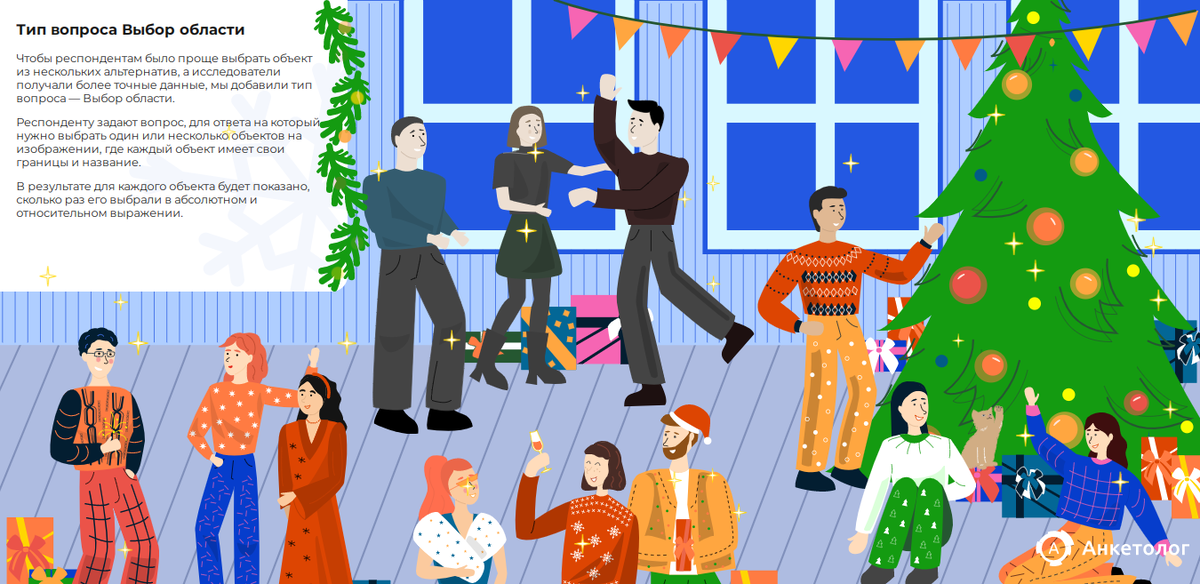 Пример: Для того, чтобы рассказать пользователям об обновлениях онлайн-сервиса в течение года, мы в «Анкетолог» создали отдельную страницу. Пользователь «входит» в комнату, где в ожидании праздничной вечеринки собрались сотрудники «Анкетолога». С помощью курсора-волшебной палочки нужно нарядить каждого из них к празднику, а он, в свою очередь, расскажет об обновлениях сервиса. А если погладить котика под елочкой – за окном пойдет снег.
