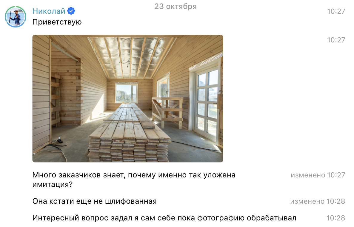 Работы у нас много, но мы успеваем и поболтать о работе. Делюсь одной из переписок: наш фотограф Николай подкинул нам полезную идею для контента. Глядя на фото кажется, что имитация бруса просто лежит в доме. А теперь приглядитесь. Не просто так она лежит, а по технологии 🤩 Каждый слой разделён между собой рейками, чтобы доски не соприкасались. ☝️ Это важно при просушке. Ведь несмотря на то, что сухой пиломатериал поставляется в вакумной упаковке (по крайней мере, так утверждает производитель), он всё равно «набирает» влажность. Особенно осенью и зимой во время хранения и транспортировки. ☝️ А ещё это важно, когда мы шпаклюем неровности древесины, чтобы шпаклёвка не прилипла и качественно просохла. Знали про такое? Ставьте лайк, если статья была полезная и интересна, и подписывайтесь на наш блог «Дед Лесовик». Мы строим дома и бани из профилированного бруса камерной сушки и клеенного бруса.