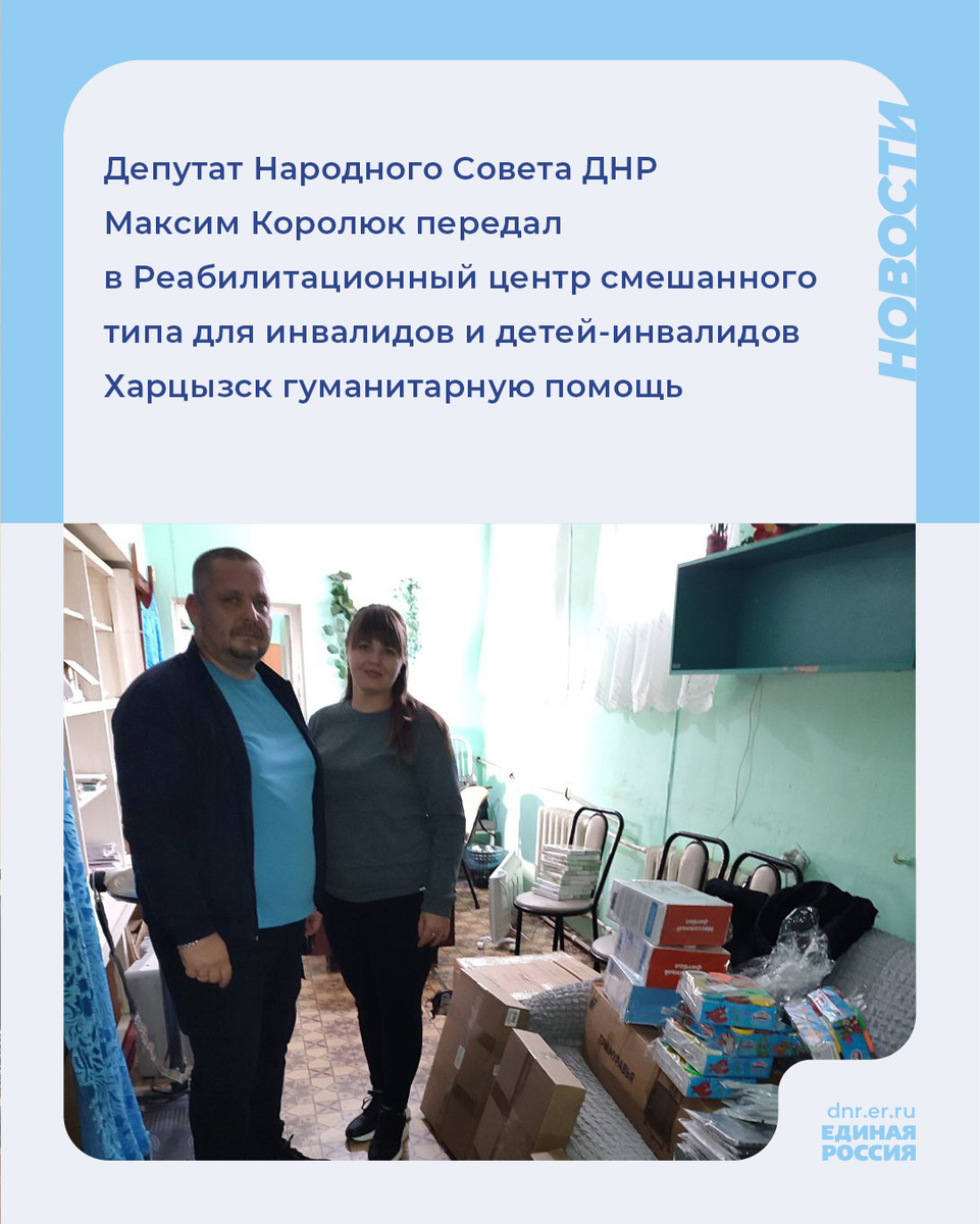 📚 Делать добрые дела и помогать окружающим – задача каждого партийца Единой России. Особенно тем людям, которые нуждаются в поддержке в силу различных обстоятельств. Депутат НС ДНР Максим Королюк передал в Реабилитационный центр смешанного типа для инвалидов и детей-инвалидов города Харцызск канцелярские принадлежности, развивающие материалы и спортивный инвентарь. 💬 «Огромное спасибо за содействие в приобретении всего необходимого Андрею Миркулову. Воспитанников центра не оставим, будем и дальше поддерживать и всячески помогать. Иначе просто нельзя», – отметил Максим Королюк. #ЕРДНР #МыВместе #ЕдинаяРоссия