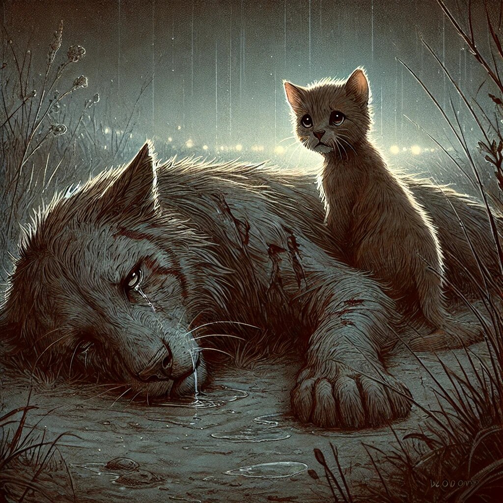 Летали майские жуки. Ветви деревьев колыхал теплый ветерок. Из-за кустов выглянула кошка. Вся ее морда была в шрамах и рубцах, что говорило о многочисленных битвах. Она осмотрелась, снова нырнула в кусты и выскочила оттуда на поляну уже с котенком в пасти. Он был рыжим, как и кошка, грязным и у него не было одного глаза. Кошка шла осторожно, то и дело оглядываясь. В ее глазах боролись нежность к своему маленькому сыну и страх. Уже две недели путешествовала так кошка. Всю ее кошачью жизнь преследовали неудачи. Изгнание с родных земель, битва с ястребом, смерть котят... Мать единственного выжившего дитя уже не надеялась найти себе новый дом. Кошка лишь путешествовала и делала остановки, чтобы поспать, поохотиться и накормить котенка. Вдруг послышался шум и рев. Зверьки приближались к городу. Кошка подошла ближе и выглянула из-за высокой травы. Впереди сидел и умывался кот. Мимо проносились машины, а он не боялся. Неожиданно около него остановился большой автомобиль. Из него вышел человек