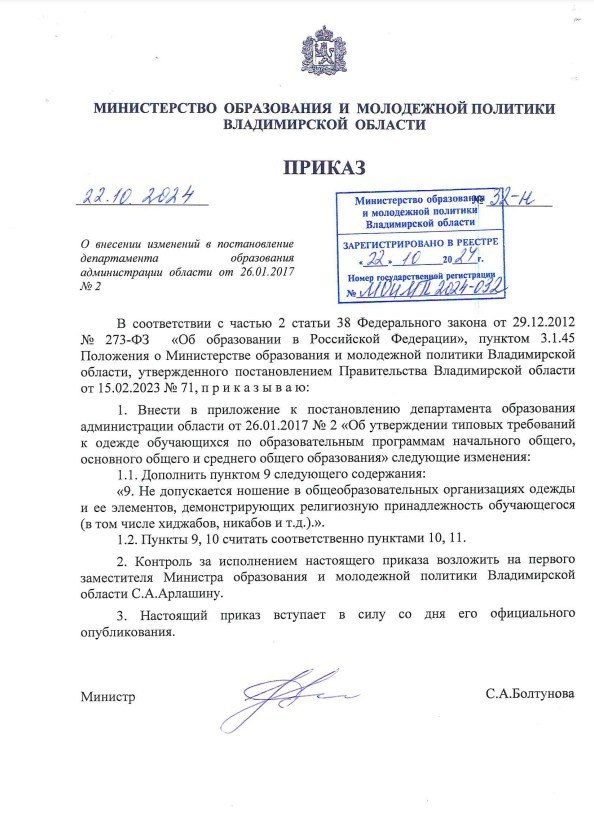 Таким образом, Владимирская область сделала впечатляющий шаг, который заслуживает нашего уважения. Она демонстрирует, что светские ценности могут и должны занимать первостепенное место перед религиозными символами в общественном пространстве. Если мы хотим видеть сильное и светское общество, где каждый человек будет чувствовать себя частью общего целого, то мы должны поддержать этот запрет. Ведь светская школа – это место, где дети учатся быть частью общества, а не отделяться от него из-за культурных различий. Поэтому в школе нет места для хиджабов.