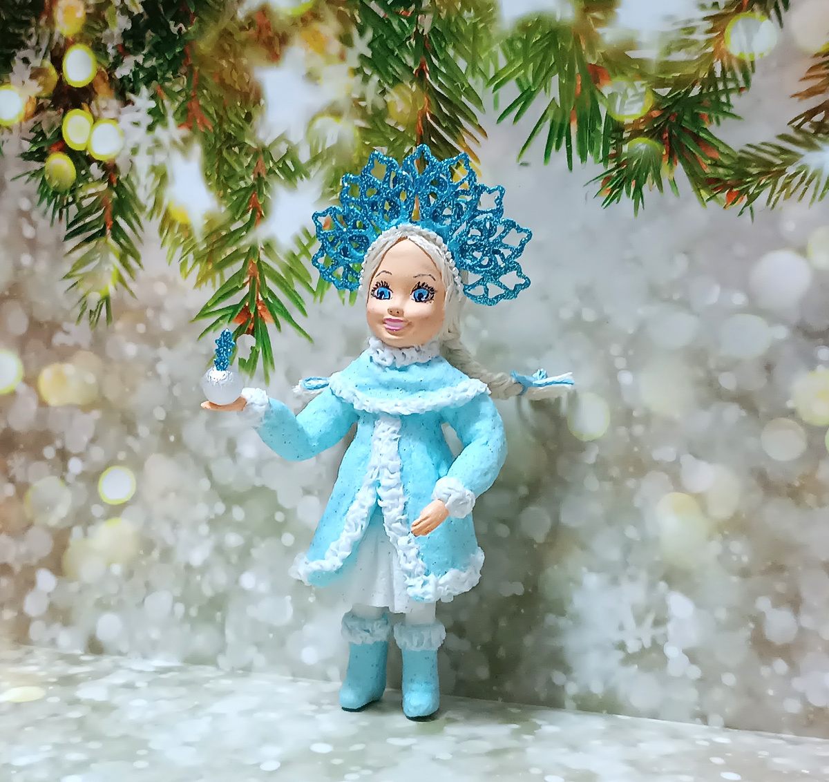 Добро дня, дорогие друзья! Вот и закончена моя снежная девочка. По традиции после ряда видео-МК хочу рассказать о подробностях творения Снегурочки. Подборка всех МК: Куколка на каркасе из фольги, мне очень нравится именно этот вариант основы - гибкая и незатратная по финансам. Ручки и ножки отливала из гипса. Причем, если ладошки я делала именно для прямого назначения, то ботиночки послужили просто ровной основой для валеночек. Очень удобно формировать обувь из ваты, наматывая слои на нужную болванку: Работала в этот раз с окрашенной ватой - обнаружила много преимуществ по сравнению с ватой белой. И главные из них - не нужно окрашивать после просушки (что в разы экономит время), а также итоговый внешний вид игрушки. Поверхность, не подвергнутая окраске, смотрится гораздо легче и естественнее. Правда, и стоимость профессиональной окрашенной ваты дороже... Значит, ставлю цель на будущее - научиться окрашивать материал самостоятельно. В качестве волос снова использовала нитки мулине - и
