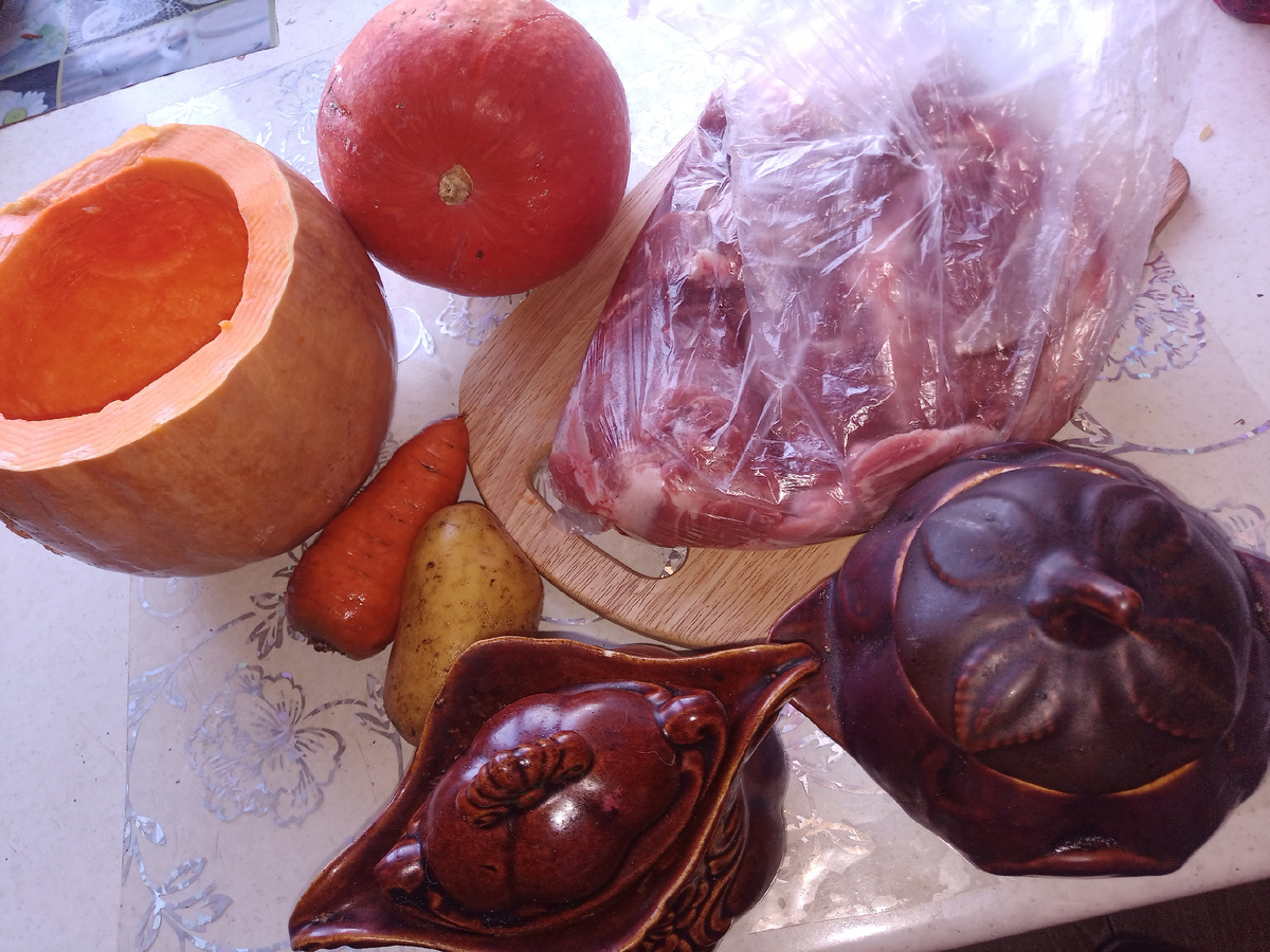 А вы уже пробовали? Признаюсь честно, я не такой уж поклонник тыквы, хотя кое-что из нее готовлю в сезон, когда собираю свой урожай на огороде. Хранится, она, в нормальных условиях, довольно долго, ну и в конце концов - есть заморозка. В этор раз, мне захотелось попробовать использовать тыкву, вместо глиняного горшочка, что бы запечь овощи с мясом! Так же, взяла обычные горшки, что бы сравнить вкус. Все ингридиенты, брала на -глаз, но примерно напишу: - Тыква небольшая 1-3 - Мясо ( у меня свинина) 500 гр - Картофель 6-9 средних шт - Морковь 1 шт - Лук 1 шт -Чеснок 5 зубчиков -Сыр -Соль, пиправы по-вкусу У тыквы отрезать верхушку, это будет наша крышечка, внутри же, все хорошо вычистить. Я на дно положила порезанные дольками зубчики чеснока и посыпала тимьяном, думаю так ароматнее будет. В горшочки просто чеснок. Картофель почистить и нарезать крупными кубиками, морковь и лук, более мелко. Мясо, кусочками , примерно, как картофель. Все, что нарезала, перекладываю в сково