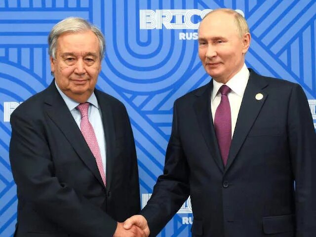 "Однако у Антонио Гутерриша фатально отсутствует подобное чутье. А ведь он - глава Объединенных Наций, он - главный в мире дипломат, он в силу своей должности - верховный защитник международного права. Уже одно то, что этот португалец облагородил своим присутствием пропагандистскую встречу в Казани - и тем самым российского президента, является скандалом. А то, что он ему еще и руку жал, любезно при этом улыбаясь, просто возмутительно", - пишет столичная газета.