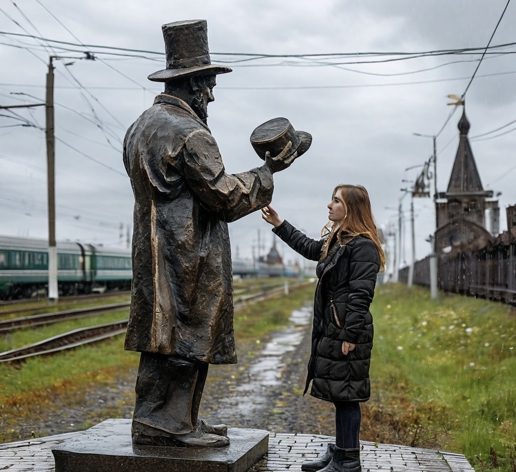Полина стояла у Памятника пассажиру, который, словно добрый волшебник, поднял шляпу в приветствии. Сегодня в Тяжине шёл мелкий дождик, будто небо тоже грустило, что пора прощаться. Но Полина знала, что каждая капелька дождя шепчет ей: Приезжал снова, Полина!» Сквер был волшебным местом — зелёные деревья, качели и дорожки, по которым Полина гуляла, словно попрощались с ней шорохом листьев. Памятник пассажиру, сделанный из гипса и надёжного металлического каркаса, стоял гордо и выглядел так, будто собирался отправиться в новое приключение. Полина посмотрела на памятник и представила, как он весело машет шляпой проходящим поездам и говорит: «Привет, друзья! До новых встреч!» А поезд дружелюбно отвечает гудком. Полина подняла глазки к небу и сказала: «Спасибо тебе, добрый Пассажир! Спасибо тебе, Тяжин, за все сказочные истории!». С неба выглянул маленький солнечный лучик, и Полина почувствовала, что этот лучик — это объятие от самого памятника! Как только она закончила прощание, на пл