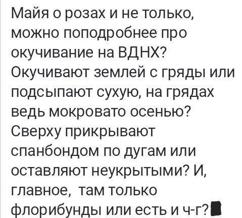 Заканчиваю серию статей об укрытиях роз дома и в городских парках. О том, как зимуют розы на ВДНХ, уже репортаж был двумя годами ранее, но вдруг что-то изменилось? Заодно решила воспользоваться последними тёплыми денёчками, полюбоваться осенними пейзажами, пошуршать листвой под ногами и просто побыть среди людей. И как-раз поступил вопрос от уважаемой подписчицы Татьяны, а у меня свежая информация. Начну сразу с ответа на вопрос. Раньше читала комментарий, что на ВДНХ "растут только кустовые розы, которые не нужно укрывать". Это вообще не соответствует действительности. Там присутствуют все виды роз: чайно-гибридные, флорибунда, почвопокровные и даже штамбы. Многие сорта очень известные и растут в моём саду, а также в садах читателей. Подробнее об этом можно узнать, перейдя по ссылке ⬇️ В комментариях подписчики определили и неизвестные мне сорта. Назову несколько сортов, которые у всех на слуху: Роза 4-х ветров, Роза Мира, Иоганн Вольфганг Фон Гёте, Чиппендейл, Аспирин, Леонард