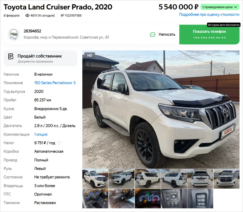 Toyota Land Cruiser Prado — очень уважаемый в России автомобиль. И на вторичке он, естественно, в цене. Но репутация надёжной и крепкой машины — это вовсе не повод пренебрегать проверкой истории конкретного экземпляра перед покупкой. Ведь даже самая симпатичная машина может оказаться котом в мешке. Наглядным примером станет сегодняшний герой рубрики «Не бит, не крашен», а именно — Toyota Land Cruiser Prado 2020 года с пробегом 85 тысяч километров и тремя владельцами в ПТС. Продают его в Московской области за адекватные на фоне рынка 5 540 000 рублей. На фотографиях нет ничего, что намекало бы на какие-то проблемы. Комментарий тоже обычный. Но обратите внимание на дату размещения объявления — 8 февраля 2024 года. Почему же столь ликвидный и «ровный» с виду автомобиль до сих пор не продали? Комплектация black onyx. Вебасто управление с тел. Цвет белый перламутр. Отличный авто, честный пробег. Перекурам и автосалонам не беспокоить помощь не нужна. Ценя временно снижена пока у меня есть ва