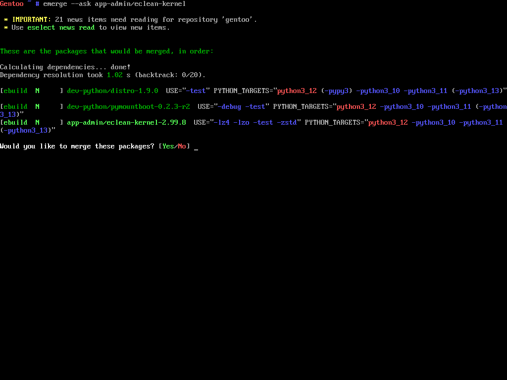 Добрый день дорогой читатель, данное повествование не является истиной в последней инстанции, это некая инструкция по удалению (в основном для собственного пользования) старых ядер Gentoo (условия таковы Gentoo установлена с использованием UEFI и на файловую систему BTRFS на чистый накопитель и системой инициализации SystemD) с пояснениями и все возможными мыслями. Действия будут происходить на KVM/QEMU для наглядности. Приступим к удалению старых ядер... Все действия будут выполнятся под root'ом. Для удаления старых ядер воспользуемся утилитой eclean-kernel, предварительно установив ее следующей командой emerge --ask app-admin/eclean-kernel что бы получить список установленных ядер воспользуемся выше установленной утилитой eclean-kernel -l что бы удалить все старые ядра выполним eclean-kernel -a но более рациональнее сохранить пару тройку предыдущих ядер, воспользовавшись командой eclean-kernel -n 3 -l или --list-kernels данный параметр покажет сколько в системе ядер -a или -