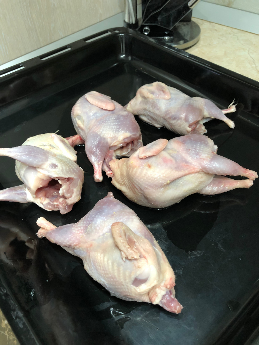 В воскресенье сосед угостил перепелками, принес пять тушек и сказал, что на сковородку хватит. Я ни разу не готовила перепелов, они такие маленькие, жалко птичек. Но в селе к этому делу относятся по-другому. Здесь это все-еда. Держат коров, быков, свиней, куриц именно ради мяса. Коров, конечно, ещё и молочных держат, продают молочку всех видов, включая элитные сыры с плесенью и без. Мясных бройлеров специально выращивают на продажу, утки будут к Новому году. Так что, скрепя сердце, пришлось приготовить. На сковородке жарить мне показалось скучным, с картошкой-банальным. Была у меня только что купленная капустина (свою не выращиваем). Я капусту называю «капуздяночка». Сделала маринад из майонеза, специй, чеснока, соли и перца, обмазала тушки изнутри и снаружи, капусту тоже смазала и присыпала немного смесью перцев. На слегка смазанный растительным маслом лист выложила все это дело, на капусту положила кружочки лука и все запекла. Ну вкуснятина же, чесслово. Зеленый лучок свой, из замор