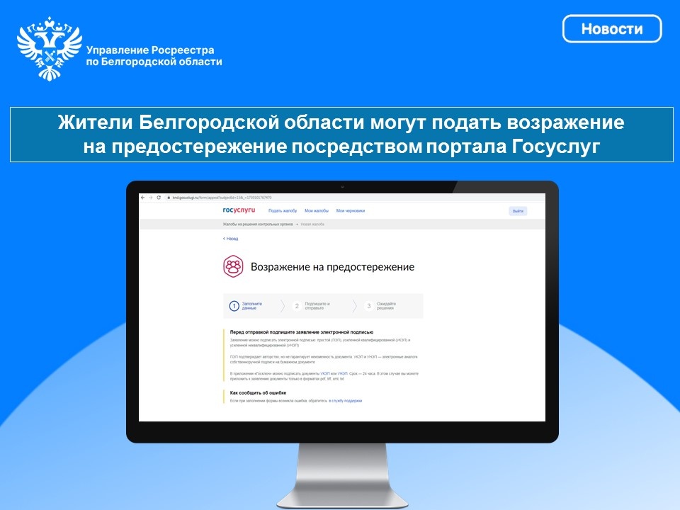 «Сегодня мы активно практикуем взаимодействие с правообладателями посредством электронных сервисов и порталов, преимущества которых трудно недооценить. Например, теперь контролируемое лицо при наличии возражения на объявленное региональным Росреестром предостережение о недопустимости нарушения обязательных требований земельного законодательства может подать его через свой личный кабинет на портале Госуслуг. Важным условием является наличие у заявителя подтвержденной учетной записи», – прокомментировала заместитель руководителя Управления Росреестра по Белгородской области Лариса Александрова.