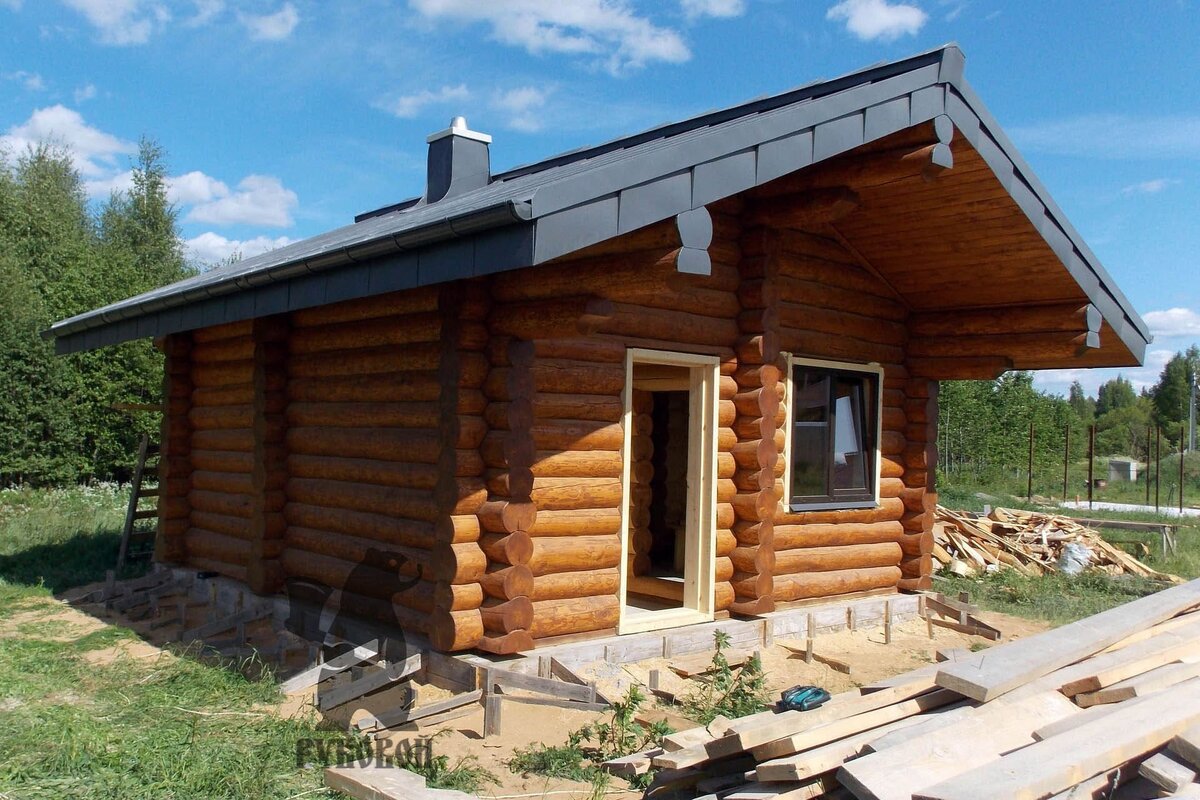 Компактная баня, в которую удалось вместить весь набор нужных помещений. Полностью отделана «под ключ» и радует своего владельца, проявившего вкус при выборе цвета стен и нестандартного материала кровли. В проекте: комната отдыха со вторым светом, финская сауна, моечная, санузел и раздевалка-тамбур Баня от проектировщика компании «Архиметрика», как и большинство наших базовых комплектаций, спроектирована из бревна d24-26 (в вершине). Расчёт теплотехнических характеристик постройки делался исходя из породы древесины сосна / ель, наиболее распространенных в Кировской области. При заказе строительства можно выбрать конкретную породу дерева. Однако существенной разницы между этими породами нет, они очень похожи. Обратите внимание на сруб, отшлифованный после прохождения периода интенсивного высыхания дерева, длительностью первые полгода после рубки сруба. Стены выглядят однородно. Между породами есть только небольшие различия. Сосна. Имеет увеличенные по сравнению с елью сучки, часто с зам