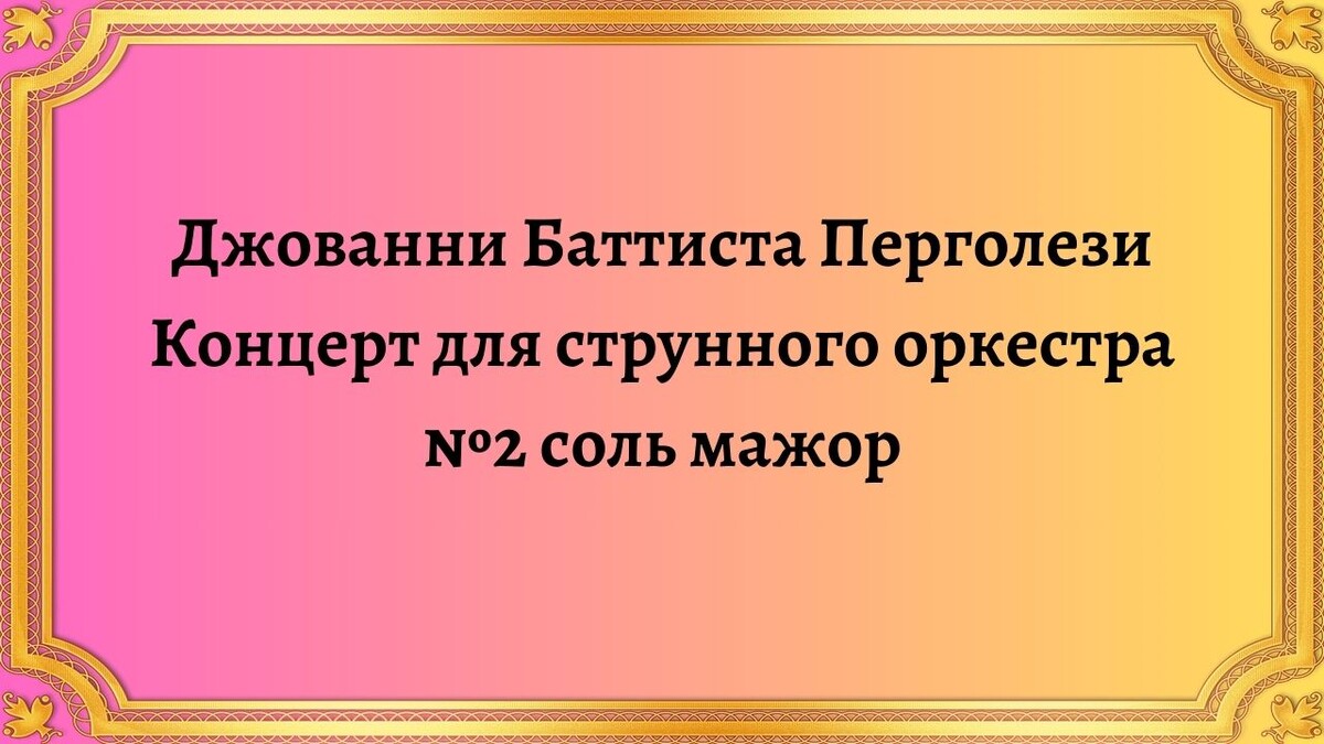 Концерт для струнного оркестра № 2 соль мажор Джованни Баттиста Перголези — потрясающий и элегантный пример итальянской барочной музыки. Перголези, родившийся в 1710 году и умерший всего в 26 лет, был наиболее известен своими драматическими произведениями, но этот концерт демонстрирует его мастерство инструментальной композиции.