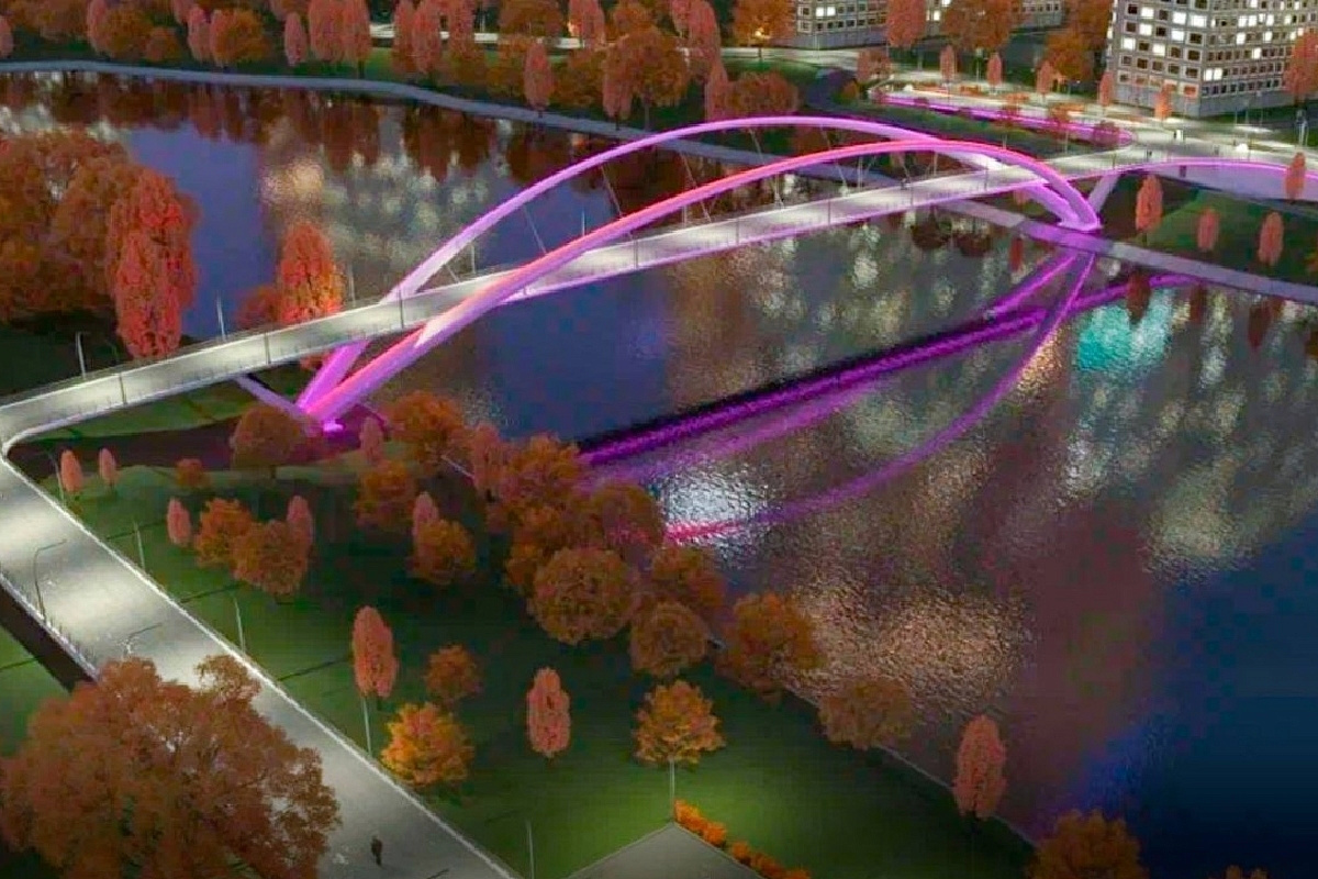 Новый пешеходный мост построят в Москве Новый пешеходный мост появится в Москве. Он соединит районы Хорошёво-Мнёвники и Крылатское. Мост будет 400 метров в длину, с округлыми арками и архитектурой подсветкой.