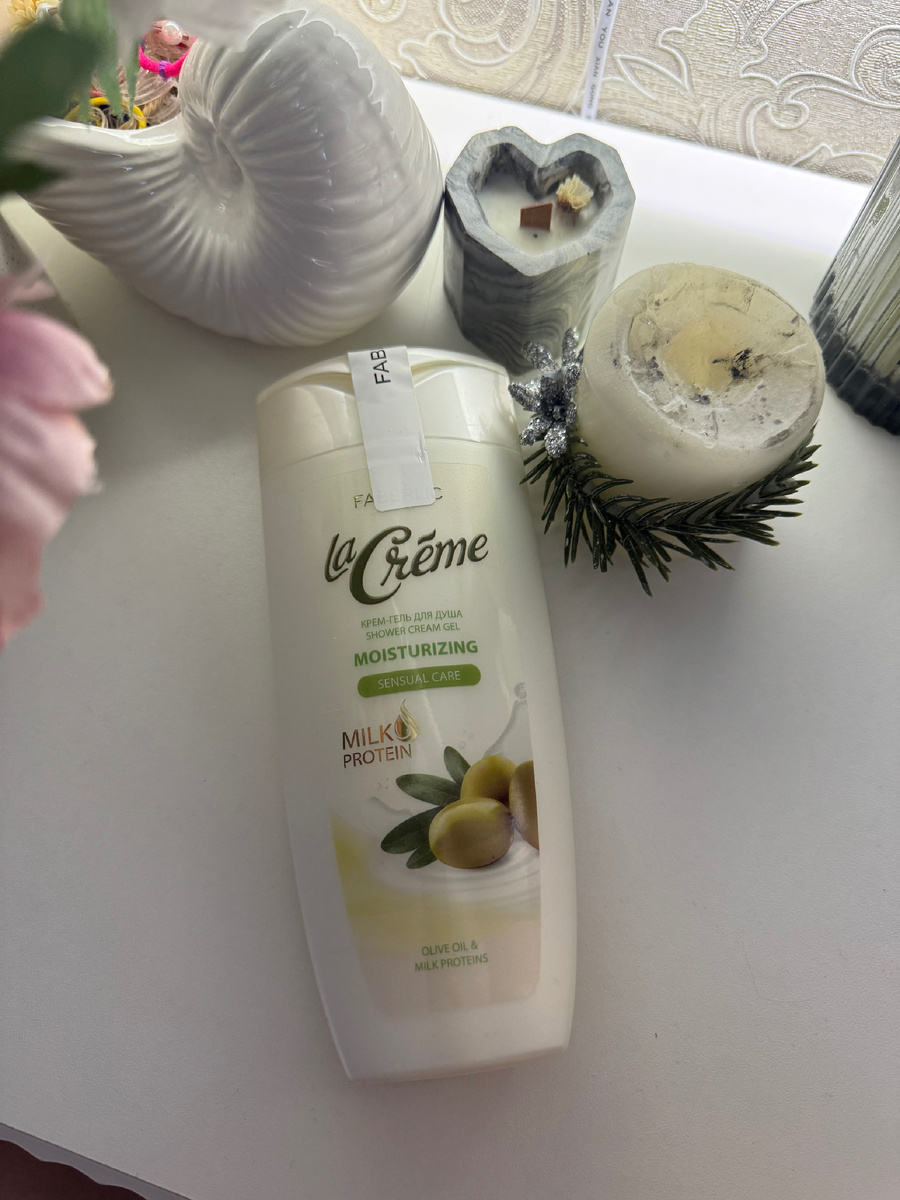 La Creme - довольно популярная линейка в нашем домашнем ухода за кожей тела. Я часто покупаю гели для душа, потому что у них отличная консистенция, хороший состав и довольно ароматные «вкусы». Я не пропускаю практически ни одного нового вкуса, так и произошло с «оливкой». У довольно популярного производителя косметики по домашнему уходу есть аналогичный «вкус», для меня он всегда был этаким эталоном - приятный, очень нежный, ненавязчивый. Но цена стала кусаться, поэтому я решила, что обязательно закажу «чувственный уход» от La Creme. Состав довольно хороший, нет никакой «химозности», присутствует оливковое масло и молочный протеин, который придает гелю очень нежную и довольно кремообразную текстуру. Объем продукта 250 мл., срок годности после вскрытия - шесть месяцев. Мы все пользуемся этим гелем, потому что он «унисекс», поэтому полагаю, что нам хватит его на месяц- полтора. Текстура геля довольно плотная, он хорошо пениться, для того, чтобы очистить все тело хватит буквально 3-5 ка