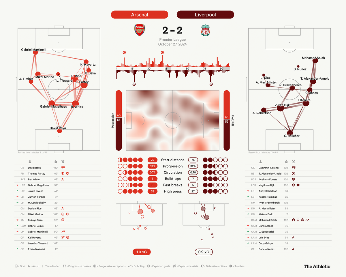 Это была молниеносная контратака после того, как выдающиеся Ибраима Конате и Александер-Арнолд совместными усилиями остановили Габриэля Мартинелли. Салах сначала действовал на фланге от Нуньеса, когда комбинация набирала обороты, но, прорвавшись в центр, даже не стал убегать от него, отправив мяч мимо Давида Райи.