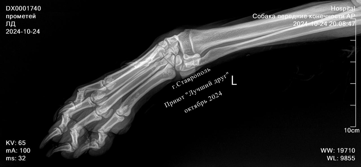 Потому что после столкновения с машиной, несущейся на большой скорости, собаки остаются лежать на дороге с переломами в лучшем случае, а в худшем упокоятся навсегда. Прометей вышел из ДТП относительно целым, по рентгену кости целые, есть рваные раны по телу, большая рана в области запястья. Предположительно, до встречи с машиной его вдобавок покусали сородичи за какие-то проделки, он от болевого шока метнулся в сторону и попал под колеса.