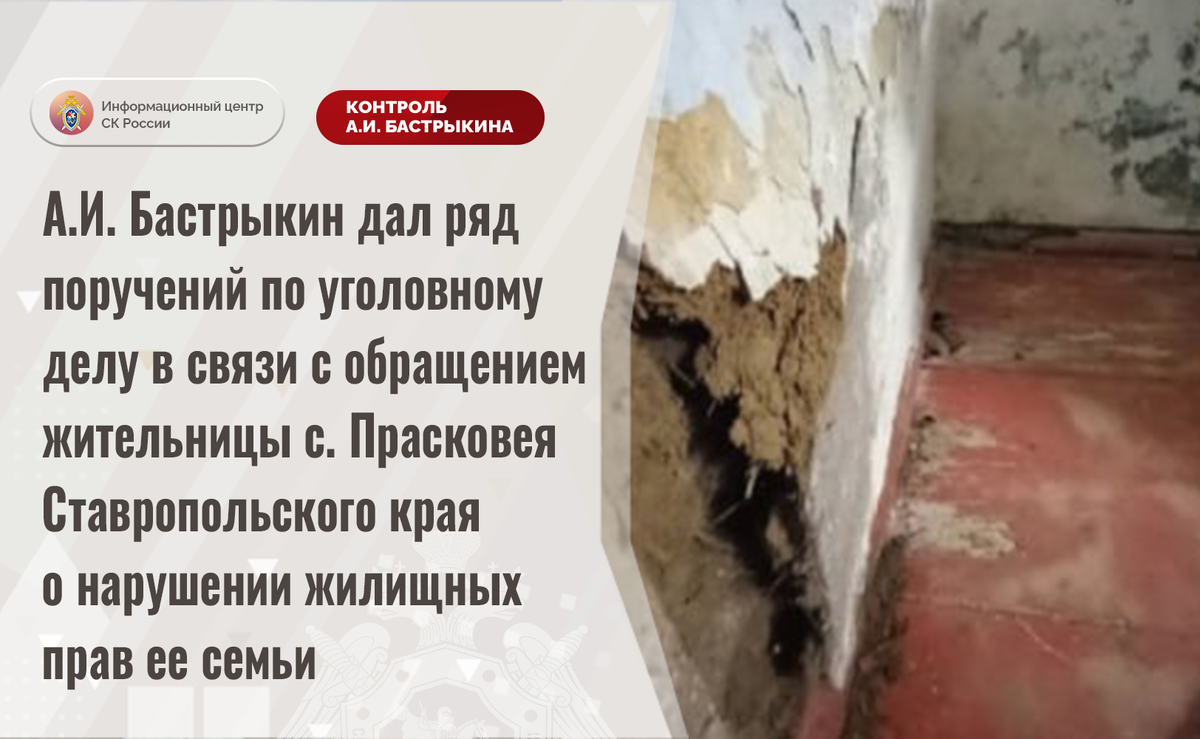 А.И. Бастрыкин дал ряд поручений по уголовному делу в связи с обращением жительницы с. Прасковея Ставропольского края о нарушении жилищных прав ее семьи В Информационный центр СК России обратилась жительница села Прасковея Ставропольского края по вопросу нарушения жилищных прав ее семьи, в том числе 35-летней дочери-инвалида. В 2004 году многоквартирный дом, где они проживают, признан аварийным. Семья заявительницы поставлена на учет в качестве нуждающейся в предоставлении благоустроенного жилья, но в 2019 году из очереди исключена. До настоящего времени их права не реализованы. Они продолжают проживать в здании, в стенах которого имеются трещины и существует угроза его обрушения. Многочисленные обращения в компетентные органы результатов не принесли. Ранее А.И. Бастрыкин поручал представить доклад по указанной ситуации. В СУ СК России по Ставропольскому краю расследовалось уголовное дело, которое прекращено. Председатель Следственного комитета Российской Федерации Александр Иванович