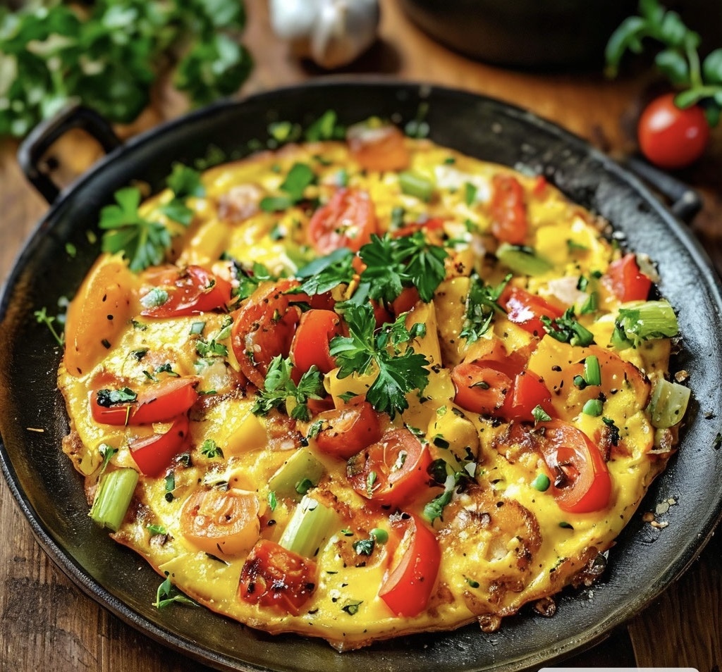 - Обжарьте шпинат и помидоры на сковороде, затем добавьте яйца.